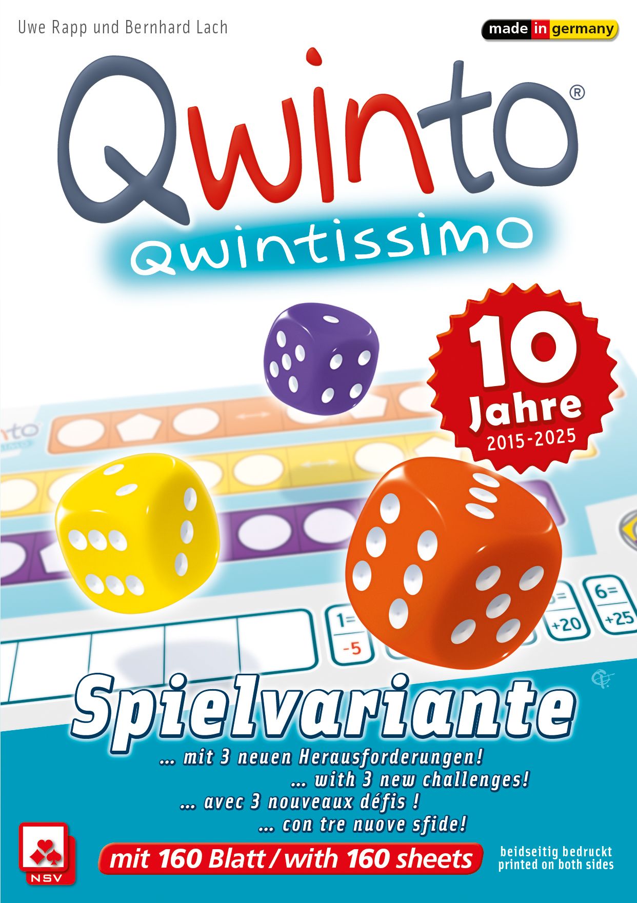 Descrizione: Qwintissimo is an expansion block for the game Qwinto. Qwintissimo was released to celebrate Qwintos 10th anniversary. Gameplay remains largely the same, with players trying to fill the rows on their scoresheets with numbers as quickly — and as highly — as possible in order to score the most points.