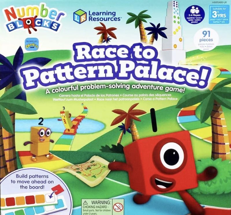 Descrizione: Learn about and create patterns as you move Numberblocks One to Four over bridges, through twists, and around turns on the game board, using colored tiles to create the patterns shown on the pattern cards.
