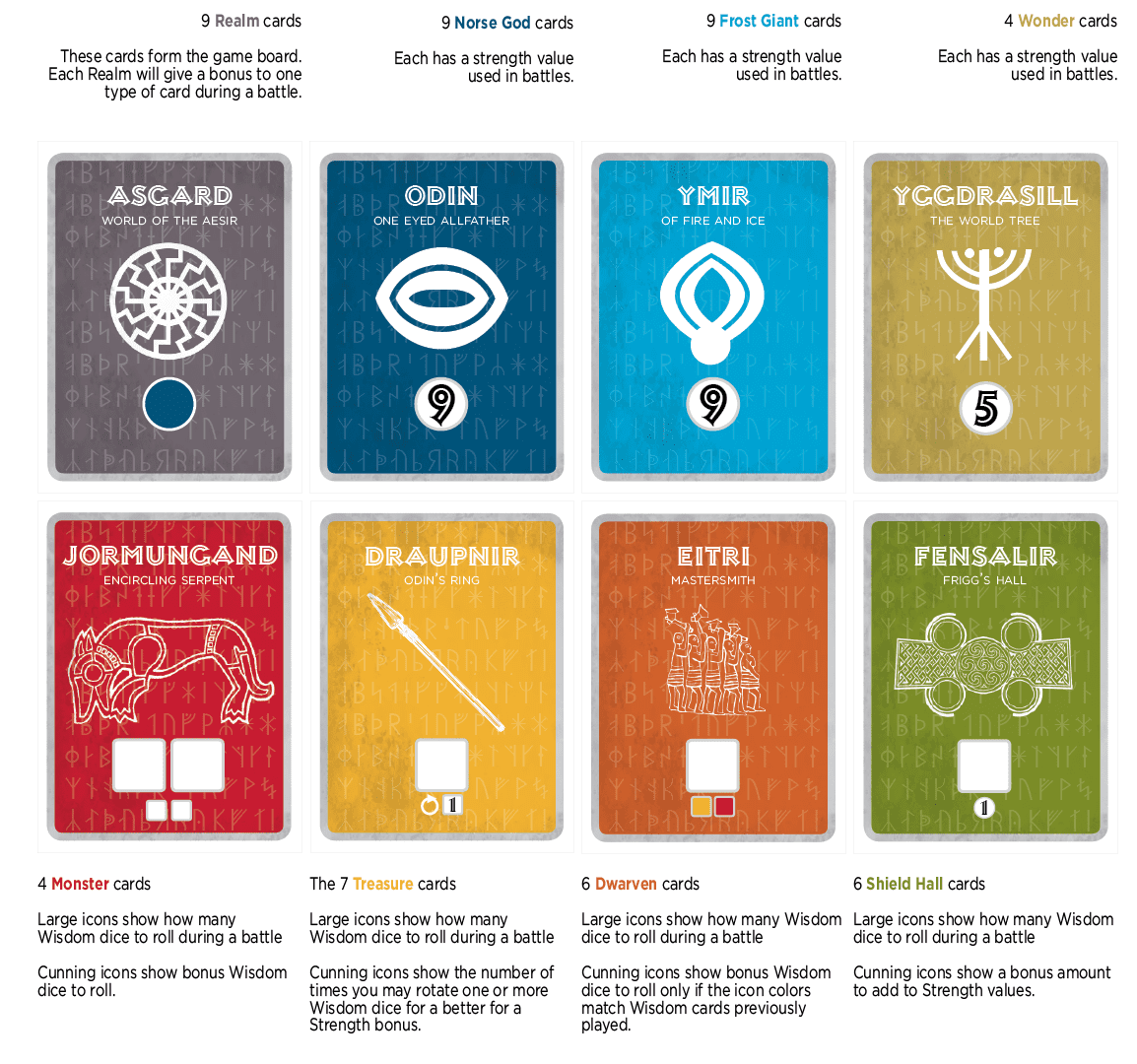 A Strength card (Frost Giant of Norse God) is played first, followed by 2 cards from your hand (Wisdom) allowing you to roll a number of dice to add to your Strength. Lastly another card is played (Cunning) allowing modifications to the dice rolls.