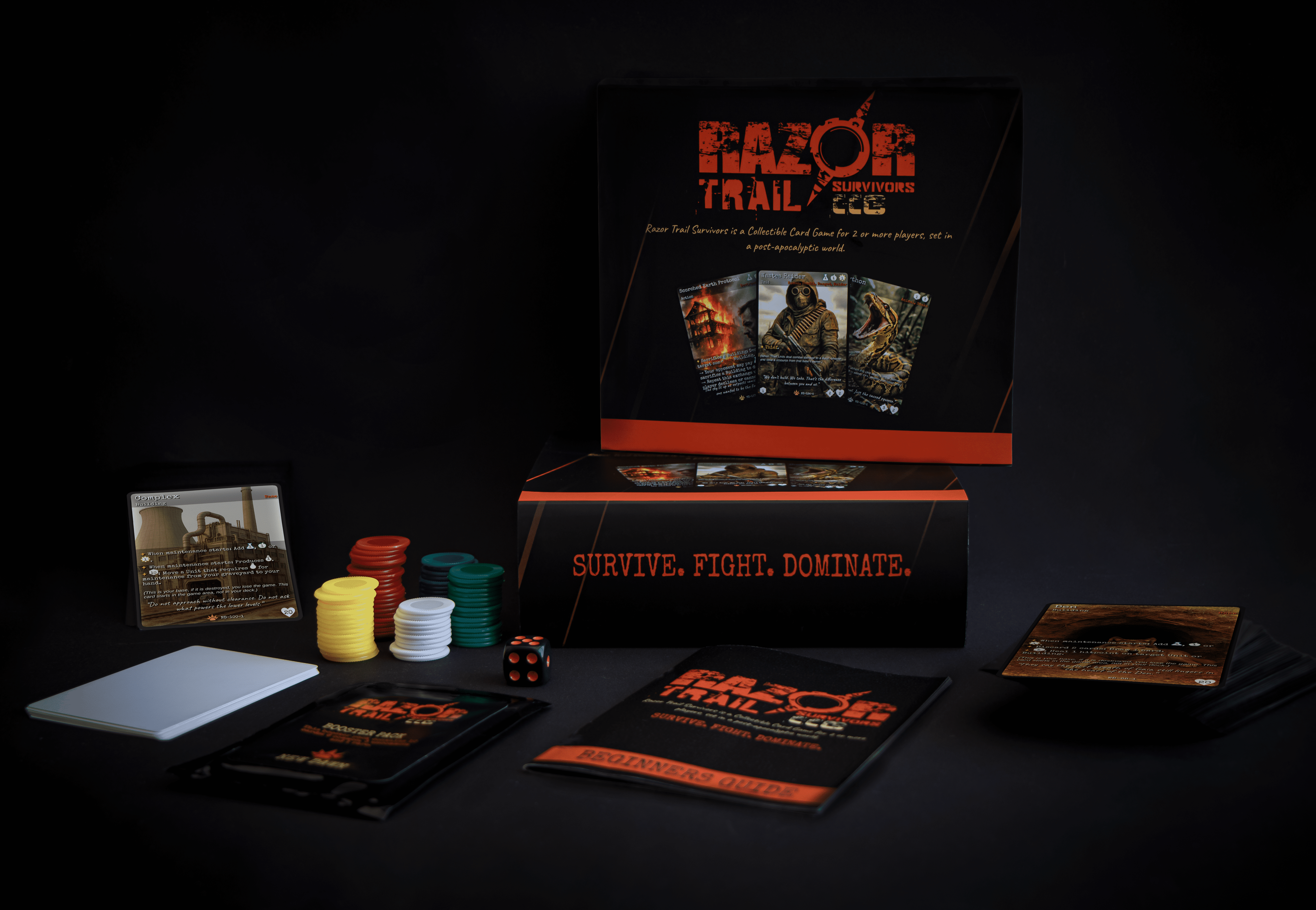 Descrizione: Razor Trail Survivors is a strategic collectible card game set in a gritty post-apocalyptic world. Unlike typical fantasy CCGs, Razor Trail Survivors uses photo-realistic artwork instead of the overused cartoonish drawings that dominate the genre, and delivers a grounded, survival-based setting. Besides the pre-made decks, players can build their own, choosing from over 300 unique cards for this first edition. Each player starts with a Base card which they must protect while trying to destroy the enemy's base. To do this, they use Units to attack and protect, supported by Actions, Operations and Upgrade cards. All of these cards have a resource cost, which are typically generated by their Base or other Building cards. —description from the designer