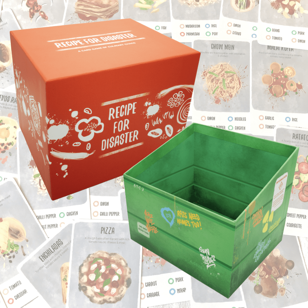 Recipe for Disaster is a new set collection card game with a twist where you will be collecting the necessary ingredients for a dish by any means necessary - Even a hectic, timed dumpster dive!