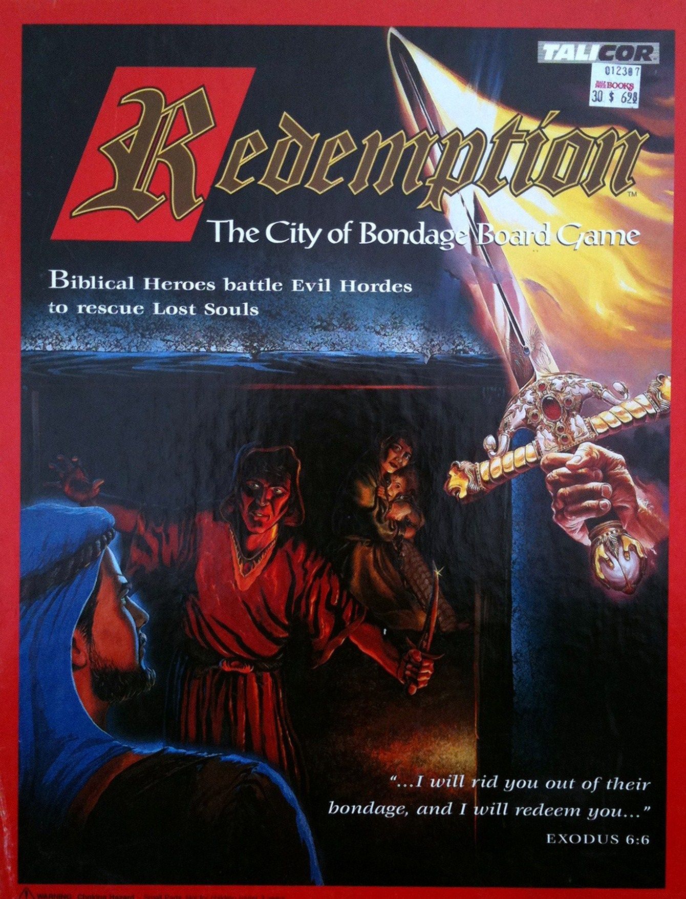 Descrizione: The map is an overhead view of a walled city; very deserted and run down looking with a Crystal Well in the center. There are 12 stand up figures (w/ matching attribute card) for players; each based on a Biblical hero. Each hero has different attributes: strength, wisdom and faith. There is a deck of cards containing Evil Biblical characters (specific, named characters as well as generic, ie: Prophets of Baal), additional Heroes that you can add to your force (strengthening by diversity of attributes) and Lost Souls.