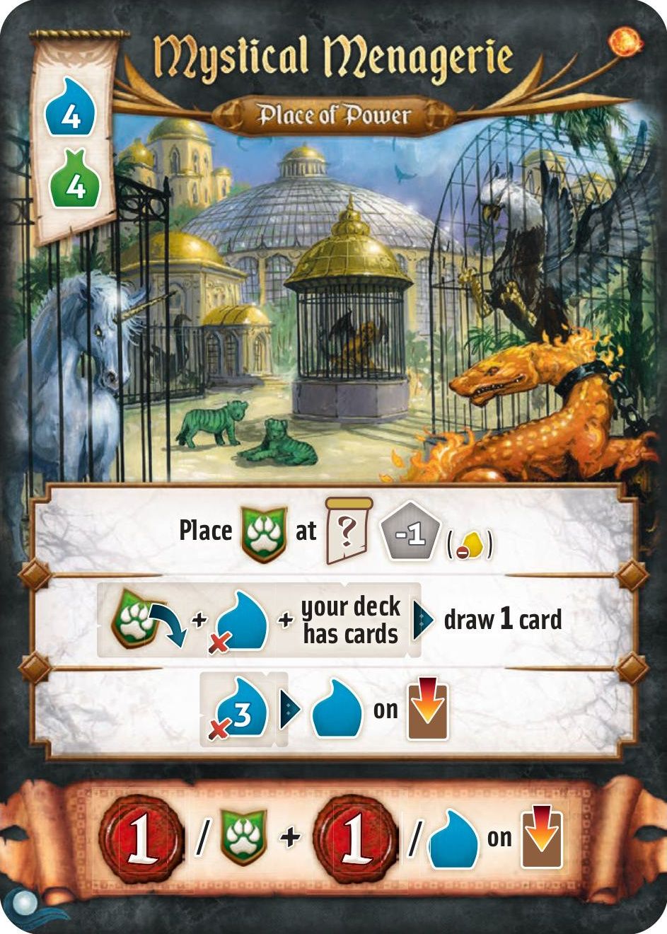 Descrizione: This Place of Power was released as print and play file for Res Arcana in multiple languages. With one change, it was later included in "Res Arcana: Perlae Imperii" expansion. Mystical Menagerie Place of Power Cost: 4 Calm (blue) and 4 Life (green) essences Ability: Creature artifacts cost you one fewer essence (not Gold) Powers: turn Creature + xCalm + at least 1 card in your deck -> draw 1 card x3Calm -> 1 Calm on this VPs: 1 per Creature + 1 per Calm on this CHANGE (Perlae Imperii), 2nd power: x7Calm -> 2 Calm on this