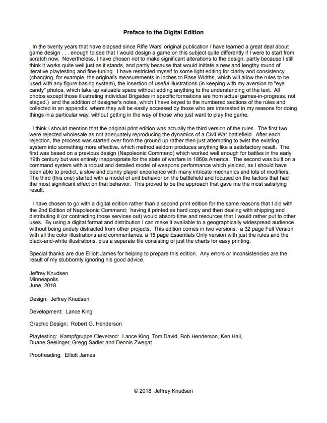 Descrizione: Rifle Wars is a rule system designed to help recreate the large battles of the American Civil War on the tabletop, using miniatures to represent the units. It is not a complete, ready-to-play package with army lists and scenarios; it is a grand-tactical level combat resolution system for those gamers who enjoy researching orders of battle and historical engagements, and then staging recreations or fictional engagements based on historical situations.