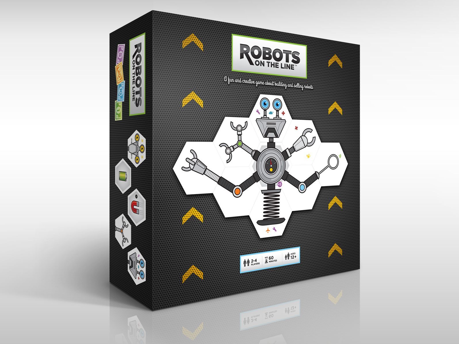 To finish a robot it must have a torso, a head, and a base with all other segments off the torso ended with the other parts. While you're building, you'll want to look to the buyers to meet their requirements. A requirement might be a robot with four eyes, or a robot that has no wheels, or a robot with three hands. If you meet a buyer's requirement, you sell it for money. If you meet the bonuses, like medical, war, or cleaning, you get even more money. The game ends when all tiles are off the line or when a player has built 3 robots. The player with the most money wins.