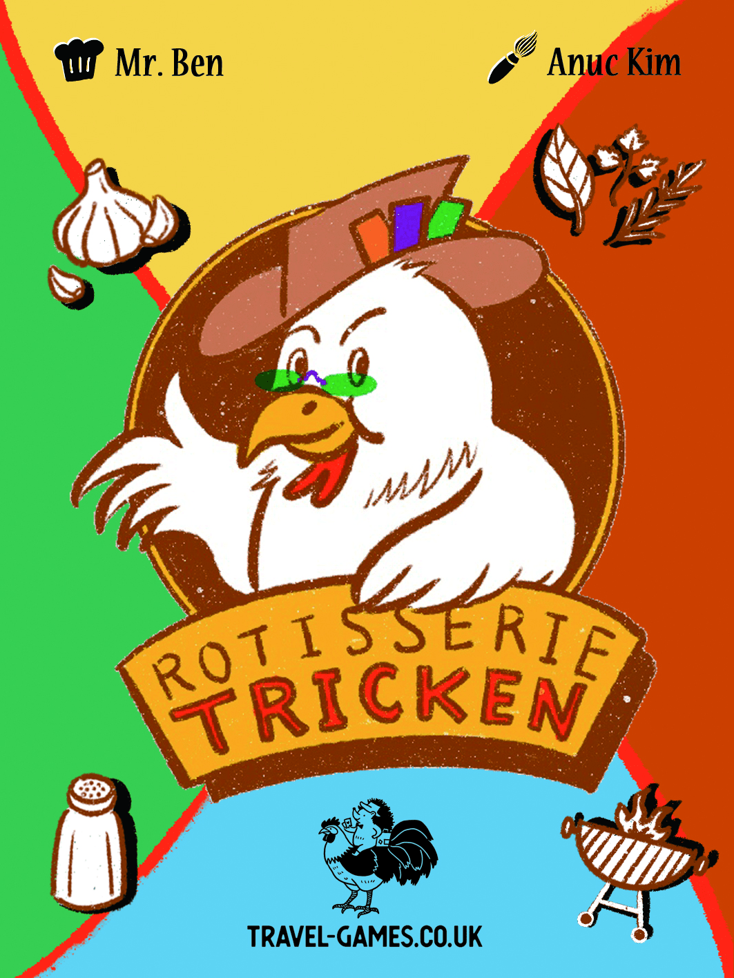 Descrizione: Rotisserie Tricken is a quick and tasty 18-card trick-taking game for 3 players, where your bidding skills will earn you the juiciest points! Each round, players aim to take tricks and hit their bid, with the lowest scorer picking the flavour of the next round (herb, garlic, barbecue, or "classic" chicken).