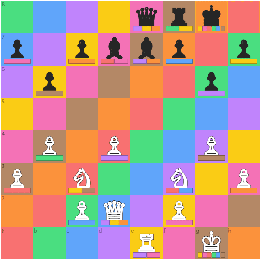Descrizione: Royal Palette Chess is an innovative and artistic variant of classic chess that transforms the traditional monochrome board into a vibrant canvas of eight colors. This redesign is not just aesthetic; in this game color isn’t cosmetic – it’s command. Every move a player makes locks the color of the square they land on, limiting what the opponent can do next. In other words, “every landing square locks a color – and steers what your rival can move next,” allowing players to shape the tempo of play and even “script” their opponent’s mistakes. By landing pieces on carefully chosen colors, you effectively “paint” positions and steer plans in a way that isn’t possible in standard chess. The result is a game that preserves the elegance of classic chess while adding a fresh strategic layer – a rare blend of familiarity and innovation that breathes new excitement into the royal game. Despite its bold new mechanics and colorful appearance, Royal Palette Chess remains highly accessible. There are no new piece movements to learn – “classic chess moves, zero new movement patterns” as the rulebook emphasizes – so veterans will feel right at home and newcomers can learn it in minutes. The only major addition is the color-lock rule, which is intuitive and actually helps newcomers by curating their choices: because only certain pieces can move each turn (those matching the locked color), beginners won’t feel overwhelmed by too many options. This means you spend more time enjoying strategy and tactics rather than getting lost in analysis paralysis, making it welcoming for less experienced players. At the same time, experienced players will find rich new strategic and tactical considerations – you’re “constantly planning not just your next move, but also how the color of your landing square will constrain your opponent”, a rule that “rewards foresight and tempo” for those who can think ahead in terms of color control. In short, Royal Palette Chess offers something for everyone: chess veterans will relish the depth and novelty of its “palette pressure” mind games, and newcomers will appreciate an easier entry into strategic thinking without sacrificing the classic moves. The theme of color is fully integrated into gameplay. The chessboard itself is a work of art: an 8×8 grid with a rotating eight-color palette pattern instead of the usual black and white squares. The colors (for example, red, green, blue, purple, yellow, pink, brown, and orange on the first rank) repeat in a shifted pattern on each subsequent rank, creating a kaleidoscopic battlefield that’s both visually striking and functionally central to the game. The standard chess pieces are also redesigned with color “palettes” printed on them – each piece displays colored bands indicating which square colors it is associated with. For instance, each pawn carries one unique color (all eight pawns have different colors), each rook, knight, and bishop has a fixed pair of colors (no two same-type pieces share the exact pair), the queen bears a tri-color palette, and the king boasts a six-color palette. These colored markings are not just decorative; they define how the color-lock mechanic interacts with each piece, ensuring that every piece has strengths and weaknesses in the face of different color locks. The overall effect is that the game looks like a rainbow-hued chess set and plays like a creative twist on chess – an experience where color theory meets strategy, and players must think like artists as well as tacticians. description from the designer