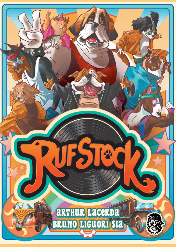 Descrizione: Rufstock is a climbing-style card game of rock ‘n’ roll dogs racing to board two buses on their way to the festival. Players receive a fixed hand of cards that cannot be rearranged, forcing them to work with sequences exactly as dealt. On their turn, they may play a combination of up to 4 cards into one of the two buses: either a Set (matching numbers) or a Sequence (consecutive numbers). Each bus has its own rule: the Kombi favors lower values, while the Bus favors higher values. However, any larger combination of cards always beats a smaller one. The previous combination is cleared and replaced when a stronger play is made, and the “boarding pass” marker shifts to the successful player. If no one can top the current combinations, both buses depart for Rufstock and reset for the next round. Players may also “pass” to draw from or adjust their hand, keeping future options alive. The first player to empty their hand scores 4 points, with following players earning 1 less each in order of finishing. After two rounds, the dog with the highest total score wins the ride to Rufstock glory. —description from the publisher