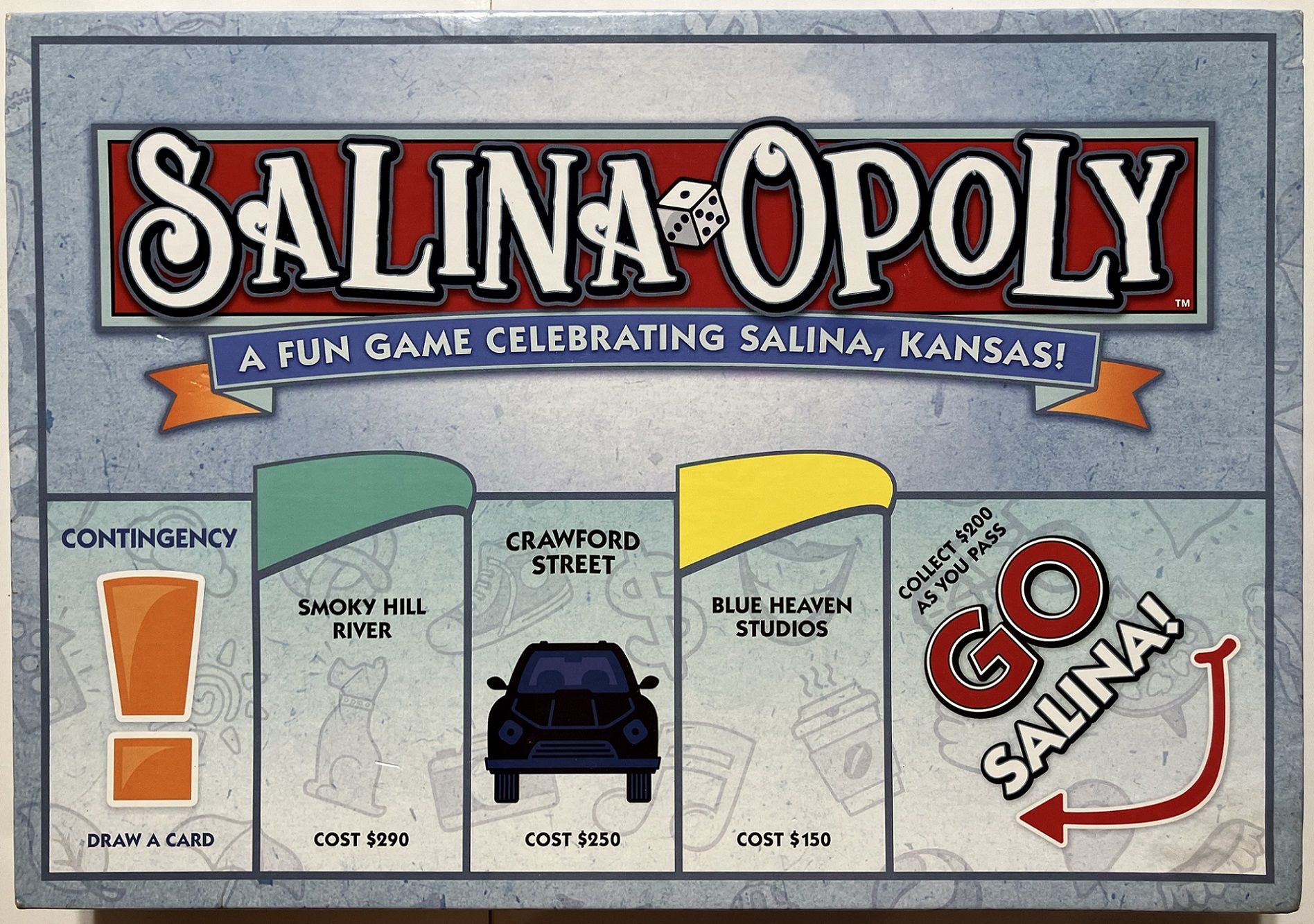 Descrizione: This is a Monopoly-Like game, based on the city of Salina Kansas in the USA. It is part of Late for the Sky's "I {Heart} ..." series of 'Monopoly' clones. With street names and various locations around the city listed as properties. There are pewter molded player tokens, the houses in 'Monopoly' are represented by a "City Block", and the Hotels are represented by a "Key to the City" pieces. Their "Chance" and "Community Chest", cards have been replaced by "Big Fun" and "Contingency" cards. While the "Property" cards are slightly different. Two versions were released, the first in 2019, and the second in 2023, with different properties names, board, card text, and new box. Most other content, such as the illustrations on the cards, is identical as the original version.