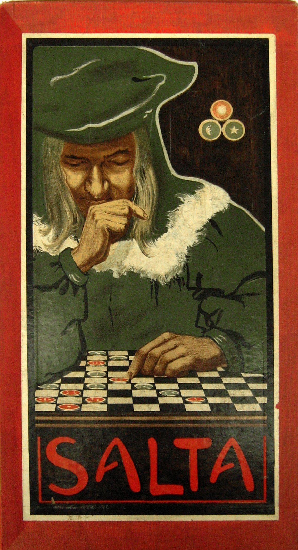 Descrizione: Two players sit opposite a 10×10 checkered board with a light square in the lower right. Each player has 15 unique pieces in his own color, arranged on the dark squares of the nearest three ranks. From left to right, the pieces are one through five stars (first rank), moons (second rank) and suns (third rank).