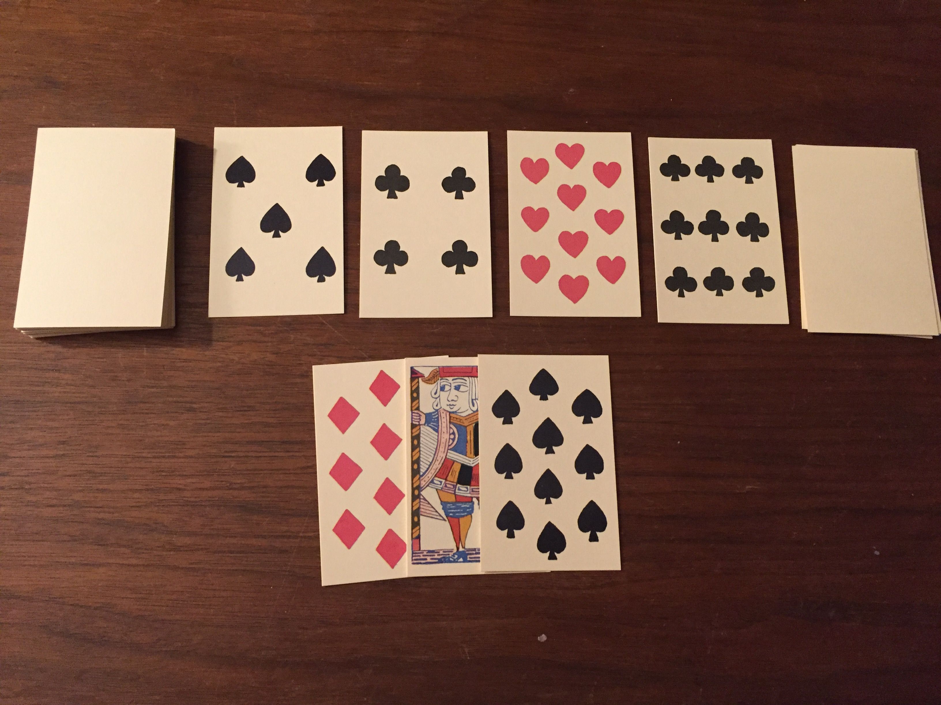All Jokers, red face cards, and red aces are removed from the deck. The remaining cards serve as monsters (spades and clubs), weapons (diamonds), and health potions (hearts) valued from 2-14 (Two through Ace). The rooms of the dungeon are created by laying out cards in groups of four. Progress is made through the dungeon by playing three of the four dungeon cards. The fourth card serves as the foundation for a new room. Rooms can be reset in their entirety as many times as needed but never twice in a row.