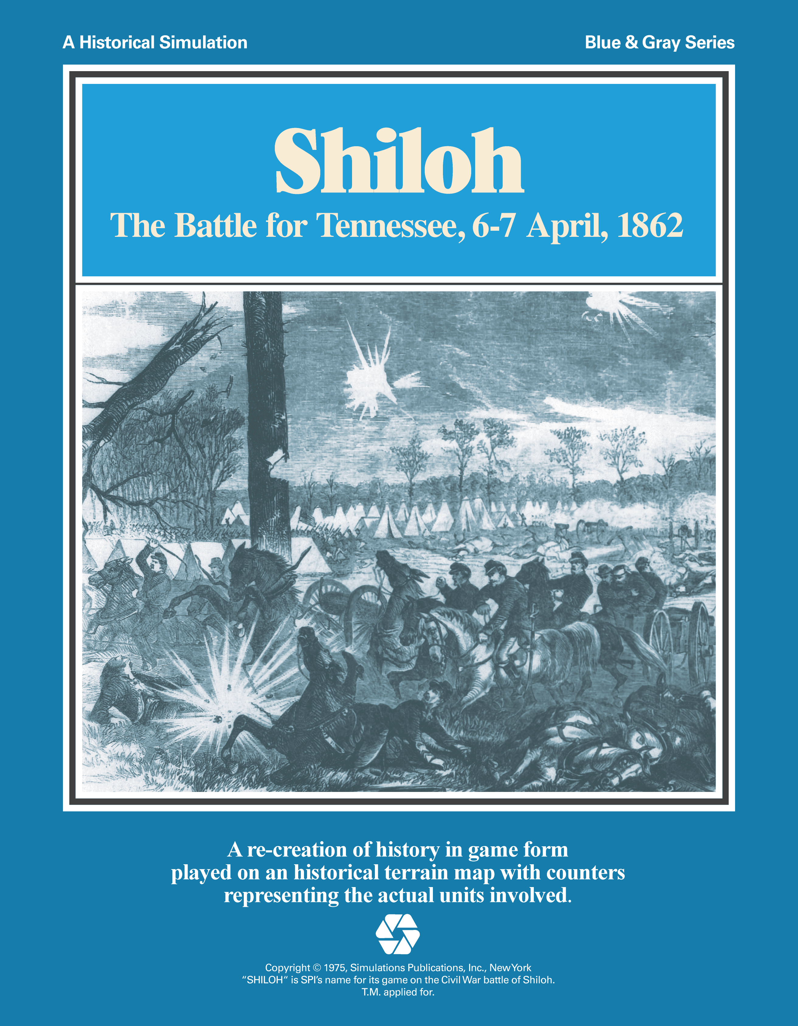 Shiloh is one of four games included in the Blue & Gray Quadrigame set. The game includes a 17" x 22" three-color map, 100 counters and an Exclusive rules folder. A Standard rules folder, containing rules common to all four games included in the Quadrigame, is also included.