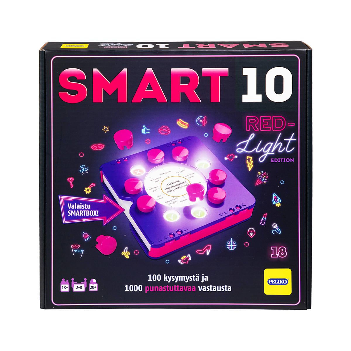 Descrizione: A special edition of the popular trivia game, featuring slightly naughty questions aimed at adults and a purple and pink illuminated Smartbox. The Red-light edition includes 50 cards with a total of 100 adult-oriented questions and 1000 blushing answers. The Smartbox for the game has lights, allowing you to play even if not all content can withstand daylight. The Smart10 game is particularly engaging and interesting. The game has fair rules, everyone gets to answer regularly, and it also encourages strategy – plus, each correct answer is rewarded. The game is suitable for 2-8 players or even larger groups playing in bigger teams. The game lasts about 20 minutes. Recommended age is 18+. The package includes batteries. All Smart10 games and question packs' cards fit all Smartboxes! You can also create your own favorite version by combining parts from different question packs. All the best elements of trivia games in one handy game that quickly established itself as a favorite for gatherings!