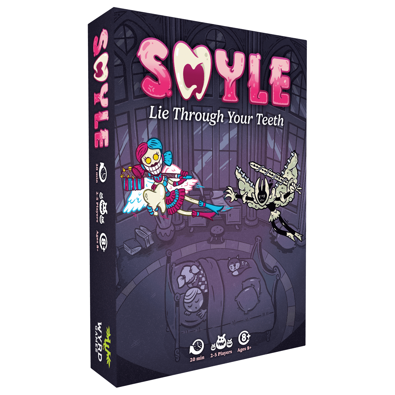 Descrizione: Smyle is a competitive memory card game for 2-5 players and ages 8+. Each player begins the game with 3 facedown Teeth cards worth either positive or negative points, and draws a hand of 4 Tooth Fairy cards. Players will know what Teeth cards they have at the start of the game but can't check their row of cards, called their Smyle, unless an effect allows.