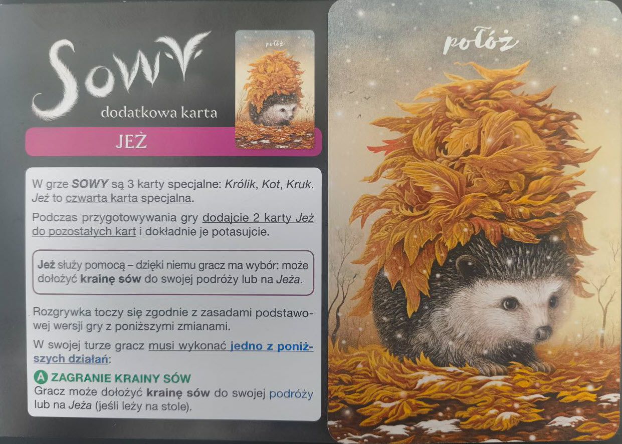 The hedgehog offers an alternative place to place owl lands, other than the journey. Lands placed on the hedgehog can be stacked, but a new land always has to have a higher value than the one currently on top. At the end of the round, all lands are placed in the discard pile, they score no points. A second hedgehog can be placed onto an existing hedgehog pile. The same rules apply.