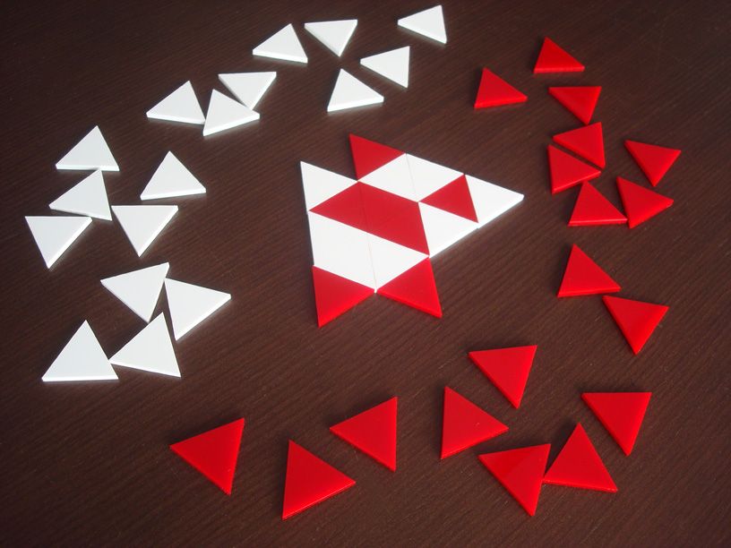 Descrizione: Each player has 25 equilateral triangles in his color. After the first tile, players alternate playing a tile adjacent to some existing tile.