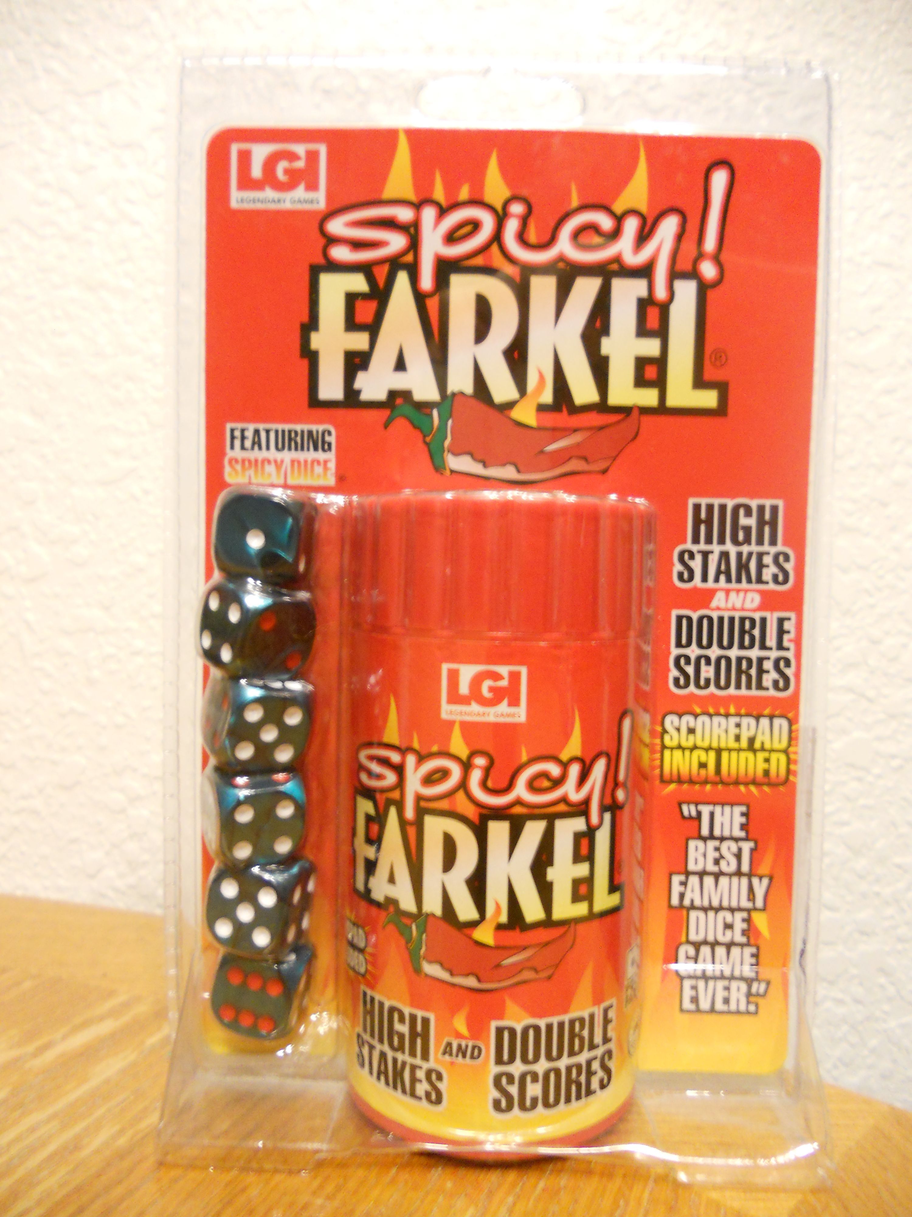Descrizione: This is a newer, advanced farkel. Instead of regular dice, included are "spicy" dice. Each of the six die has one side where the pips are red, and they alternate on each dice. When a red side is rolled it doubles your score. Plus this game's rules indicate that you play high stakes, where any dice left unrolled by a player, can be rolled by the next player, to add on to the original score.