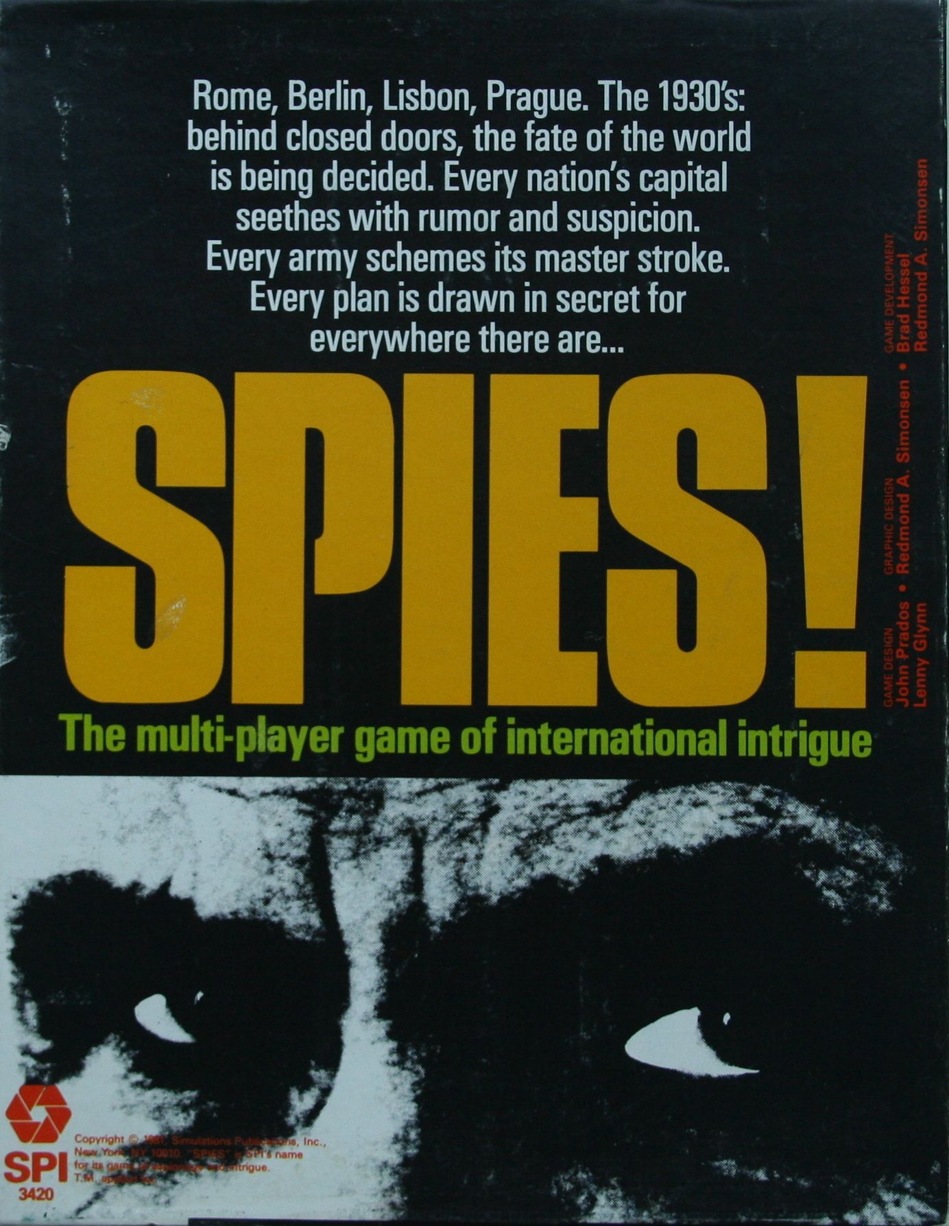 Descrizione: Spies is a game of espionage and intrigue for up to five players, set in the turbulent European era of 1933-1939. You control the secret service of one of the major powers of that era - Germany, Italy, Russia, France, and Britain - in the constant struggle to gather your opponents secrets and return them safely to your own capital while protecting your own country's secrets.