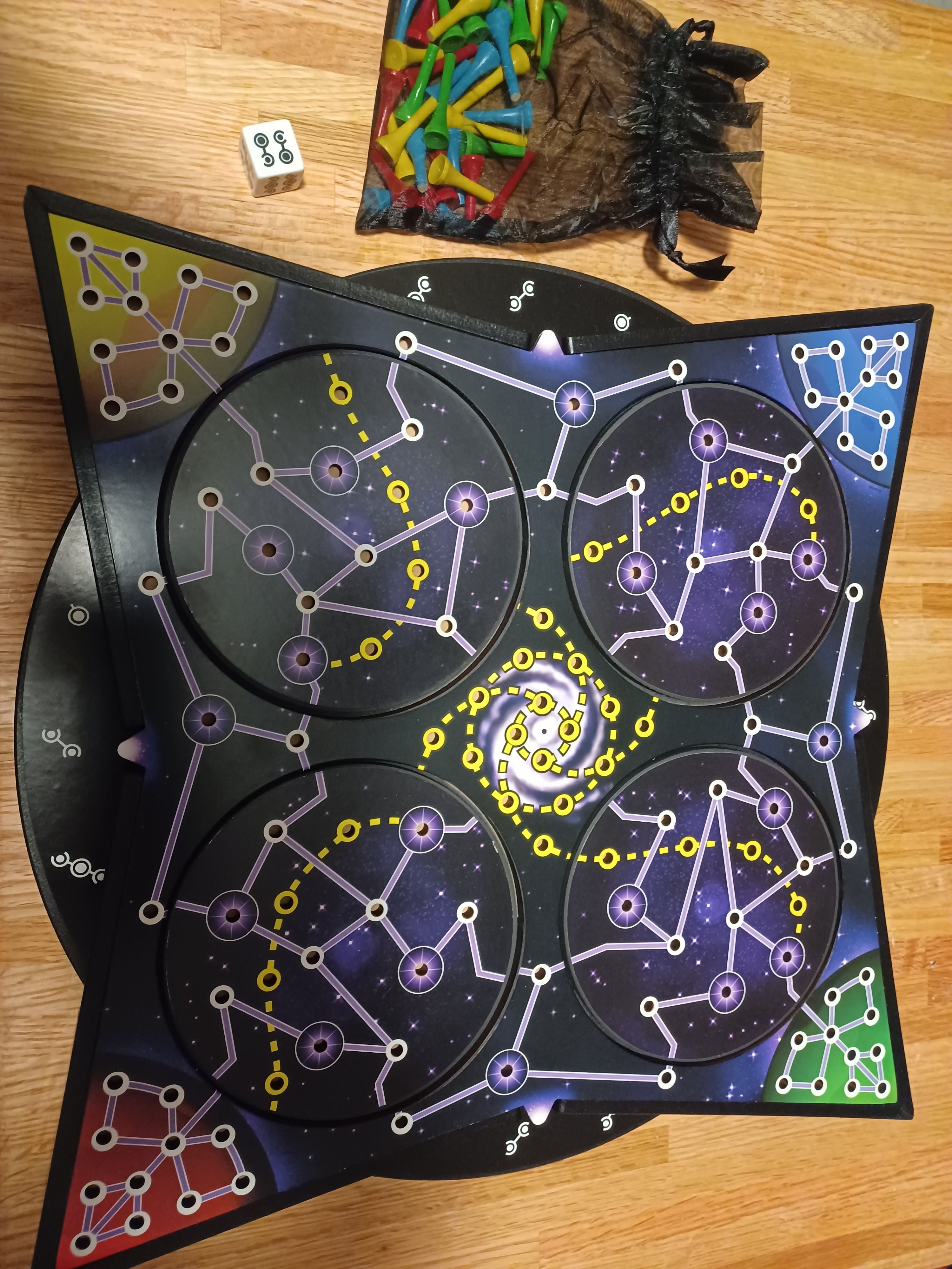 Descrizione: A Chinese Checkers-like race to get your pegs (ships) to the other side of the board, navigating along routes between various types of stars, and sending other players' pieces into the black hole, from which they need to escape. Landing on certain types of stars forces a die roll, the result of which will make sections of the board rotate - forcing you to change plans and routes on the fly.