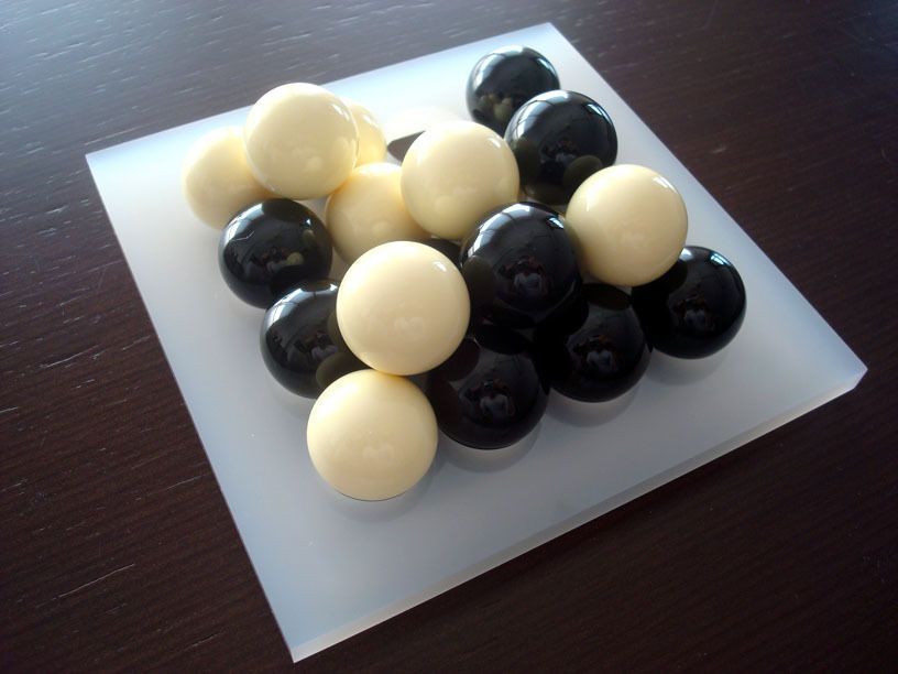 Descrizione: Spline+ was evolved from Spline by adding ball movement. It's a ball-stacking game that can be played with a Series: Shibumi set, as it uses a 4x4 holes board and balls in two colours (white and black). Larger boards can also be used, but no more than 6x6 is recommended.
