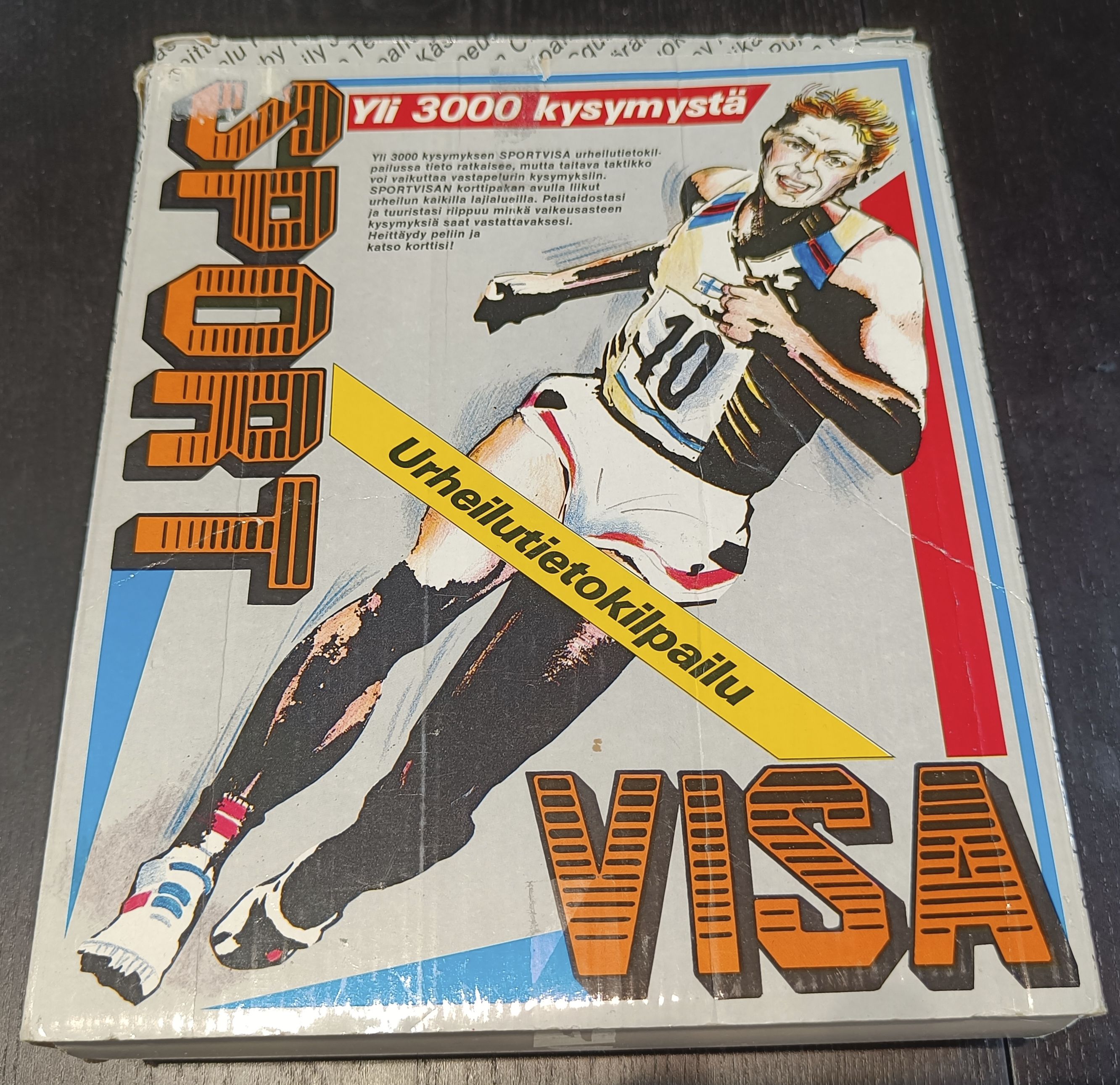 Descrizione: There is two stages in the game. First stage is a card game with standard deck of cards. Deal three cards to every player. On your turn you play a card in the table. Next player can play a higher or lower card on the table. If the played card is lower, then that player takes both cards to his/her table. If the card is higher, then the first player takes both cards in to his/her table. The player who got the cards plays the next card. This continues until all players have six card on the table. Second stage is a trivia game with categories and level of questions dictated by the cards you got from the first stage. Categories are Athletics (cross), Winter sports (diamond), Ball games (heart), Other sports (spade). Levels are Easy (2-3), Medium (4-7), Hard (8-11) and Joker (12-Ace). Player who last got six cards start the game by playing a card on the board and next player asks the question card dictates. If the answer is correct the player gets rid of its. If the answer is incorrect player discards the card and takes a random card from the deck. Then it's the next players turn to answer. (There are some minor details ignored on this rules explanation!) Winner is the player who gets rid of his/her cards first.