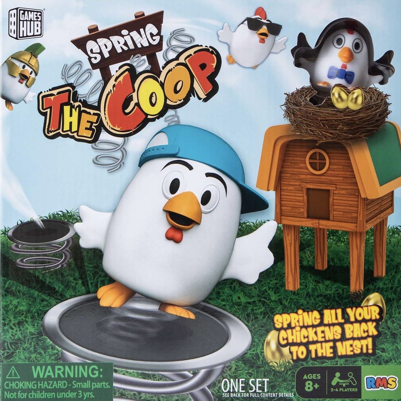 Descrizione: Get ready to launch into fun with Spring the Coop! This hilarious and fast-paced action game is perfect for 2 to 4 players, ages 8 and up. Your mission? Spring all your chickens back into the nest! Players use mini trampolines to bounce quirky chicken characters – each with their own unique look. Successfully spring chickens into the coop to earn golden eggs … the player with the most eggs at the end of the game wins!