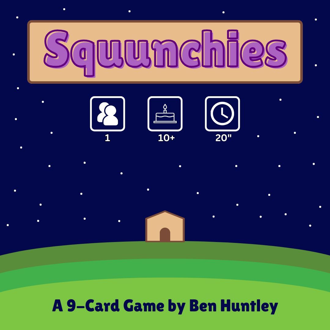 Squunchies is a creature-collecting dice management game, inspired thematically by Pokémon and mechanically by One Deck Galaxy. It features dice manipulation and placement, resource management, and a unique overlapping card system where you must choose which abilities to cover up when placing new ones.