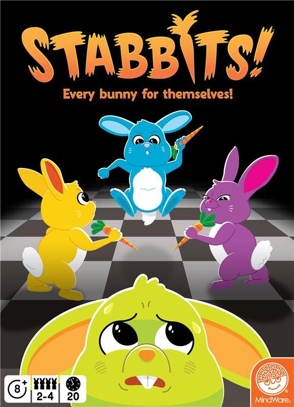 Descrizione: In this strategic race for survival, sneaky rabbits wield lethal carrots in calculated attacks - from the back! Roll the die and move around the board trying to reach other players from behind to remove them from the game. Pick up a carrot to add to your roll or hop in the rabbit hole to save yourself - temporarily. Watch your back. Avoid attack. The last rabbit standing wins the game.