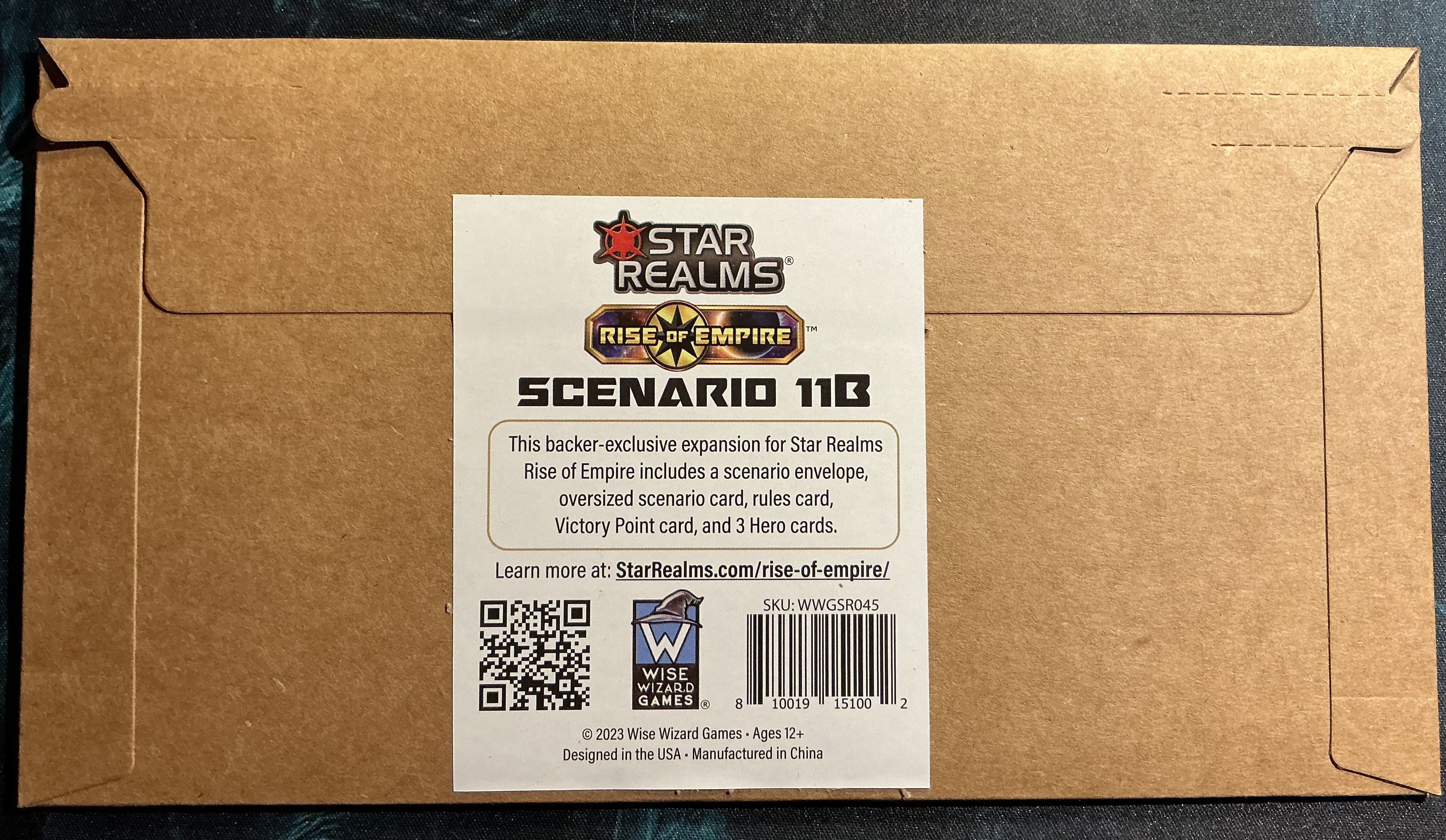 Descrizione: This backer-exclusive expansion for Star Realms Rise of Empire includes a scenario envelope, oversized scenario card, rules card, Victory Point card, and 3 Hero cards.