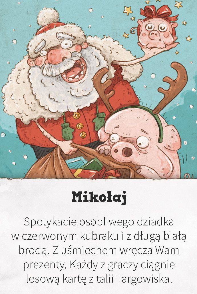 Descrizione: Promo card for the game. Card text: Mikołaj Spotykacie osobliwego dziadka w czerwonym kubraku i z długą białą brodą. Z uśmiechem wręcza Wam prezenty. Każdy z graczy ciągnie losową kartę z talii Targowiska.