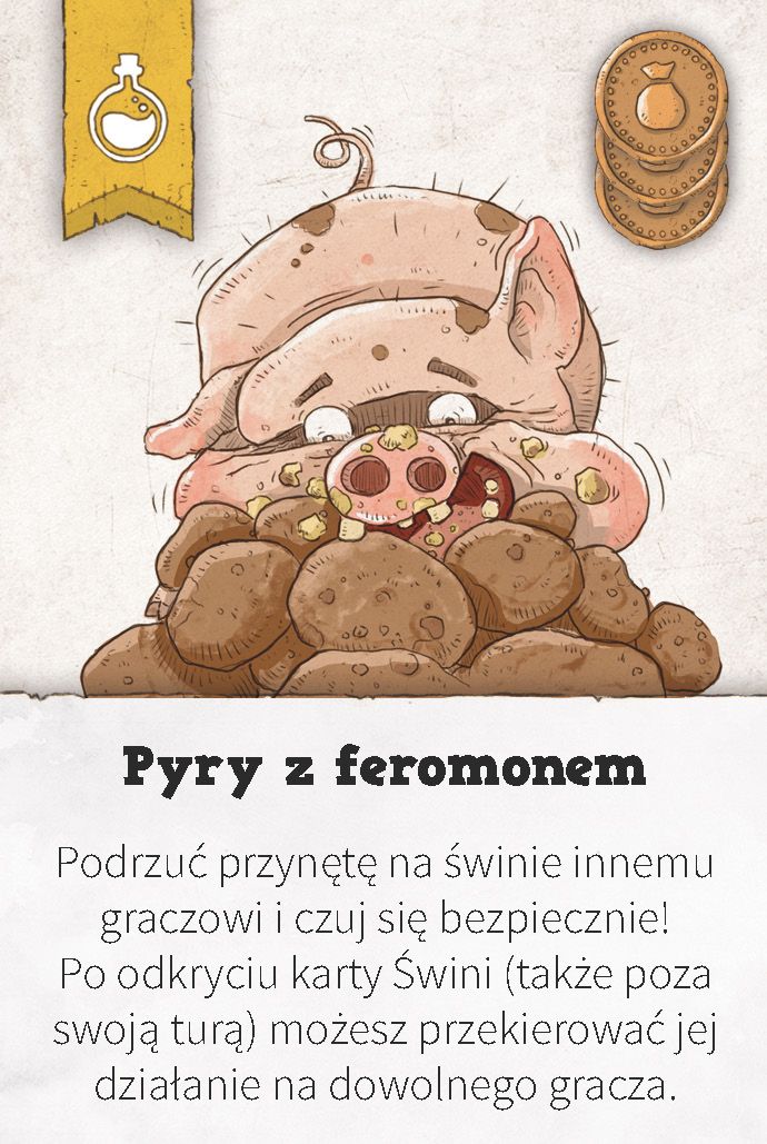 Podrzuć przynętę na świnie innemu graczowi i czuj się bezpiecznie! Po odkryciu karty Świni (także poza swoją turą) możesz przekierować jej działanie na dowolnego gracza.