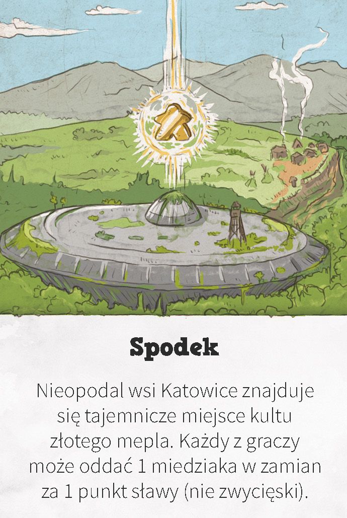 Nieopodal wsi Katowice znajduje się tajemnicze miejsce kultu złotego mepla. Każdy z graczy może oddać 1 miedziaka w zamian za 1 punkt sławy (nie zwycięski).