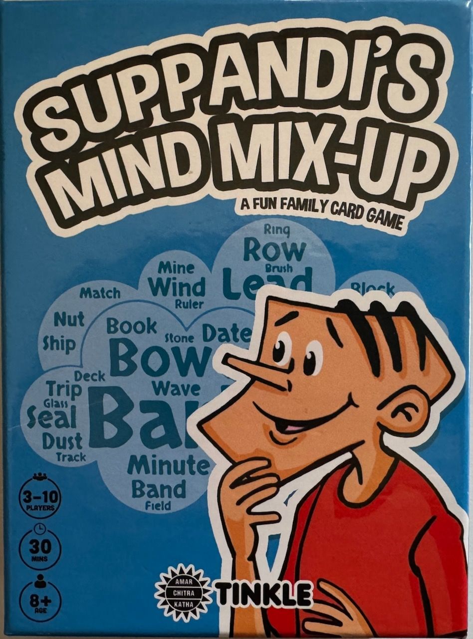 Descrizione: Join Suppandi in a hilarious battle of wit and words! In Suppandi's Mind Mix-up, players need to help Suppandi guess a hidden keyword. But watch out! Some players will lead Suppandi astray with misleading clues. This fast-paced, fun, family card game guarantees hours of laughter and teamwork with a dash of mischief! —description from the back of the box