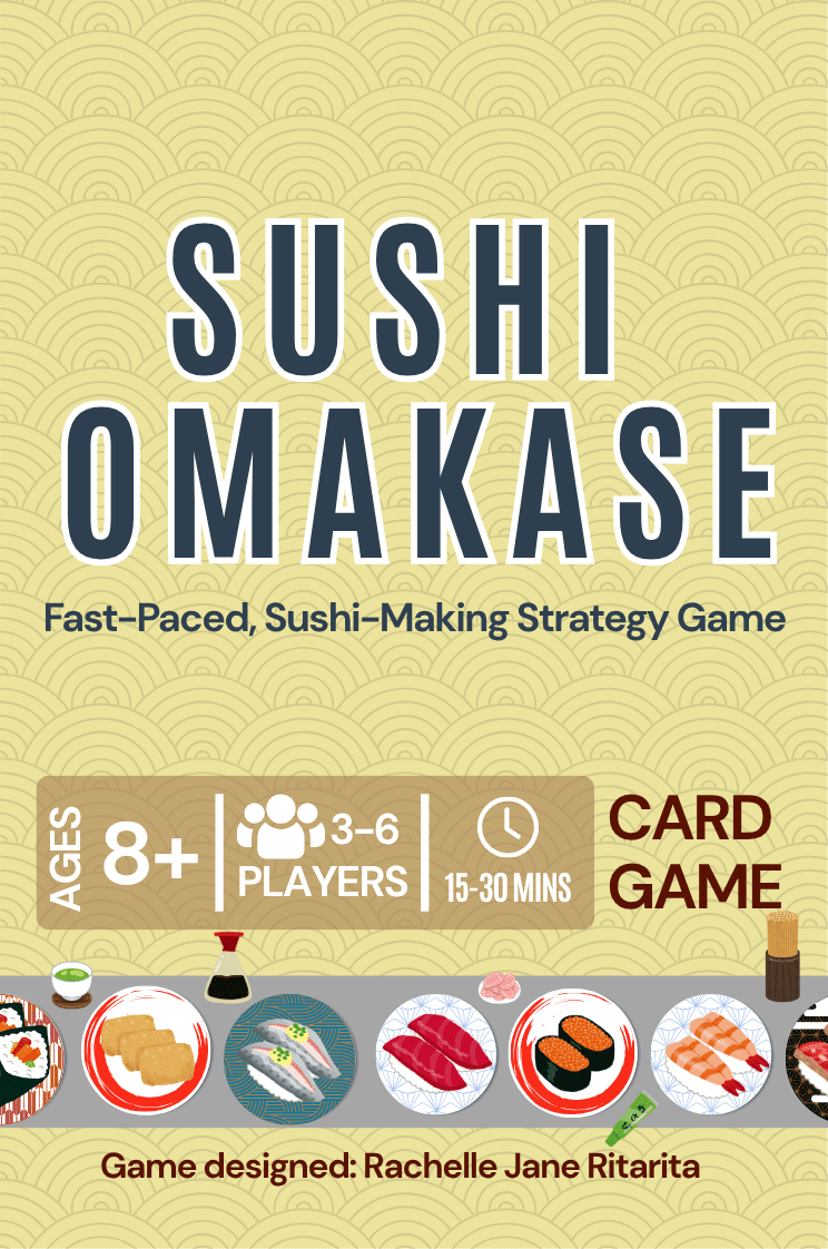 Descrizione: SUSHI OMAKASE: A Fast-Paced Sushi Card Game Welcome to Sushi Omakase Chef! Compete against fellow chefs to create the most delicious sushi dishes. Strategize, steal ingredients, and defend your recipes to become the ultimate Sushi Omakase Master Chef!?? Why You'll Love It! Easy to Learn, Fun to Master – Simple rules with strategic depth! Fast-Paced & Interactive – Engage in exciting card game with friends. Perfect for Parties & Game Nights – Play anytime, anywhere! Vibrant & Minimalist Design – High-contrast artwork and clean visuals. Objective To complete as many sushi recipes as possible. The chef with the highest score becomes the Sushi Master! So get rolling, strategize wisely, and serve up the best sushi before your rivals beat you to it! —description from the designer