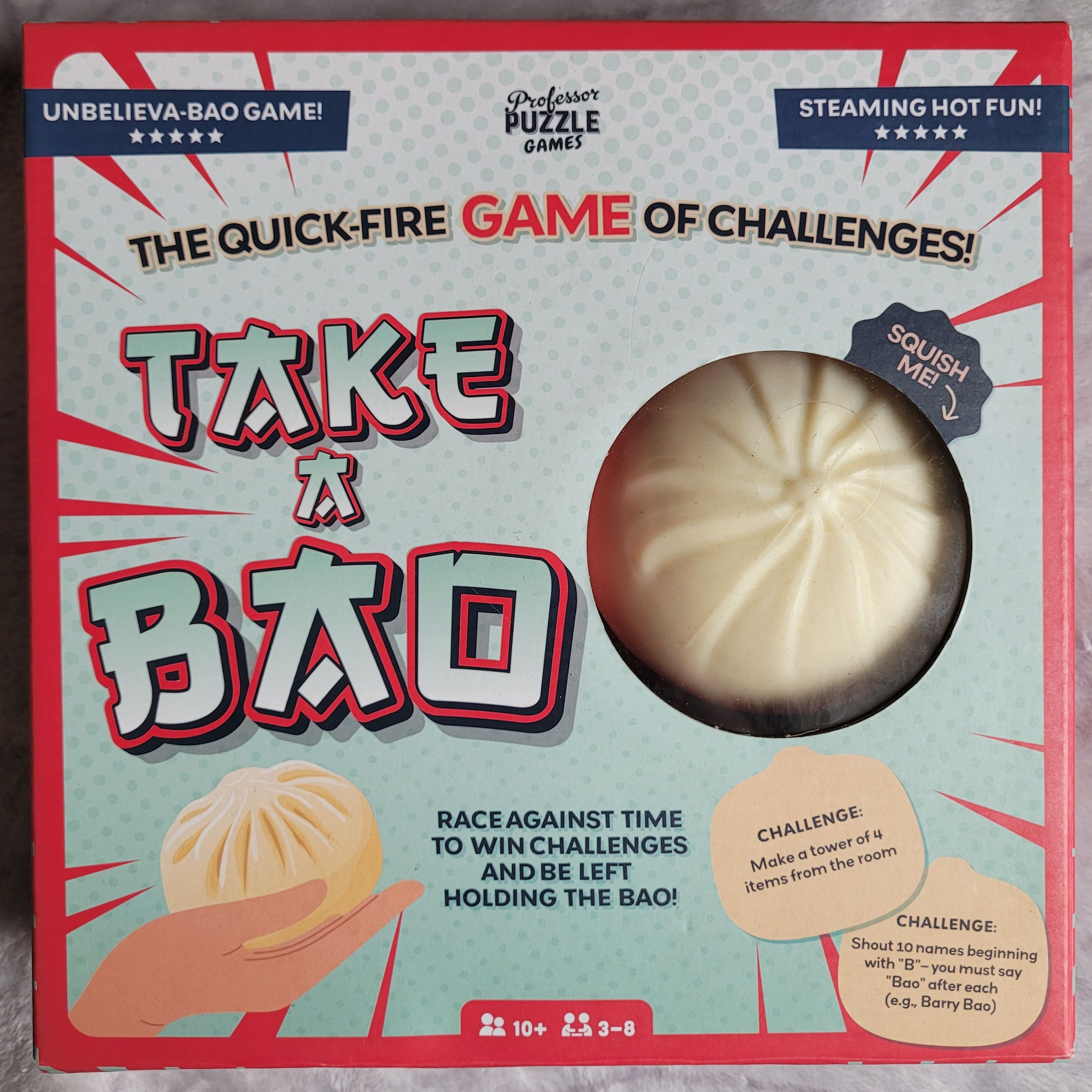 Descrizione: AIM Complete silly challenges to win points and get the Bao. Be the player left holding the Bao at the end of the round for a huge BAO-NUS! SETTING UP Put a pile of challenge cards face down in the middle of the table, next to the steamer. One player looks at the back of a random card and secretly sets a timer for that long on their phone they sit out and act as the judge this round. Give the Bao to the player who last ate one - it doesn't really matter who. Some challenges require a pen and paper, so have some handy. The quick-fire game of challenges! HOW TO PLAY The judge flips the first challenge card and reads it to the group. It will give you a task to complete. Everyone races to do the task. Whoever does it first wins the card and grabs the Bao. The judge settles any disputes. If there's a draw leave the Bao where it is and move onto the next card. NEXT ROUND Keep playing until the timer goes off. Cards are worth I point each and if you're holding the Bao at the end of the round you get 3 points. Note everyone's scores. The player to the left of the judge becomes the judge for the next round. Play until everyone has been the judge. The person with the most points wins!