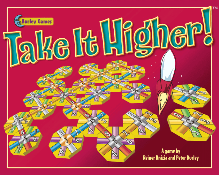 Descrizione: Take it Higher! takes "Take it Easy!" as a basis and adds three new elements. First of all, the tiles are octagonal, with four scoring lines running through them (instead of three). Secondly, the center of the tiles are either silver or gold giving you additional bonus points once you score a colored line where all the tile centers are silver or gold (9/10 bonus points per tile). Finally, when you complete a colored line, you might be able to put a rocket ship of the corresponding color on the tile you just placed. These rockets are available from the start of the game on numbered circles on the individual playing boards. At the end of the game you will receive bonus points for the highest empty space that has no rocket ships lower than it.