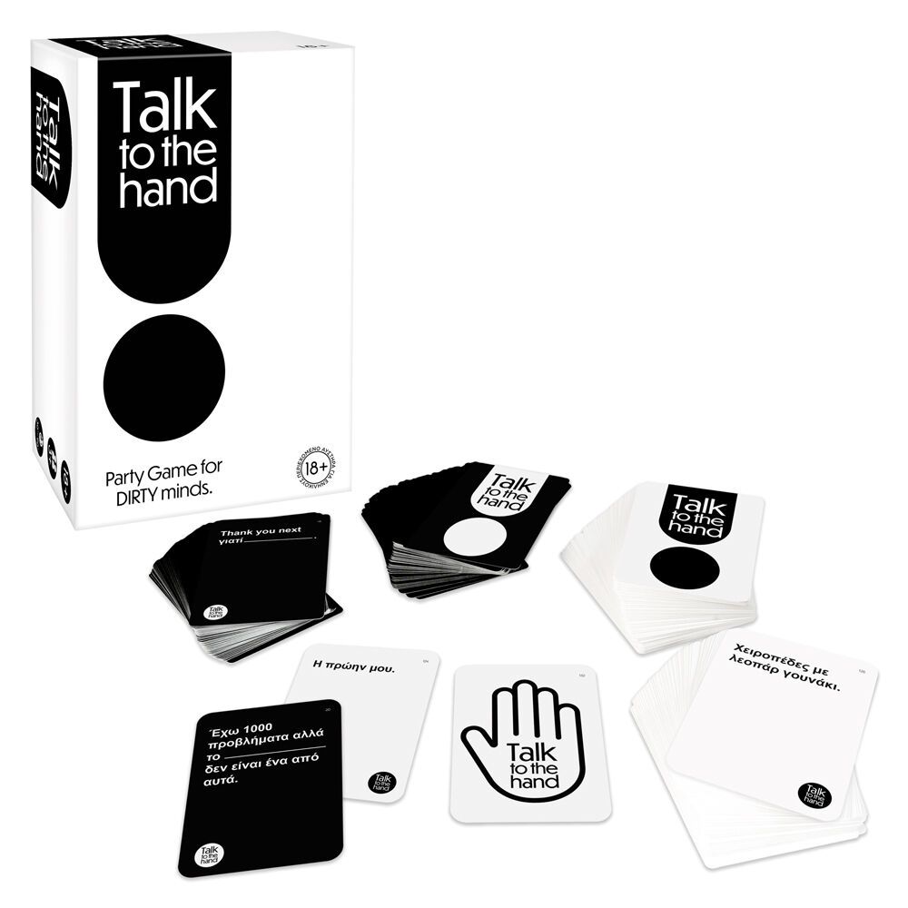 Μα γιατί το παιχνίδι λέγεται Talk to the Hand; 10 φανταστικές συνονόματες λευκές κάρτες περιέχονται στο σετ. Αν κρατάς μία τέτοια κάρτα και δεν βρίσκεις κάποια άλλη να ταιριάζει με την ερώτηση που παίζεται, τότε η τύχη είναι με το μέρος σου! Παίξε αυτή την κάρτα και με τη γνωστή χειρονομία Talk to the Hand δείξε στους υπόλοιπους πόσο looosers είναι! Το μόνο που χρειάζεται είναι χιούμορ. Τόσο απλό!