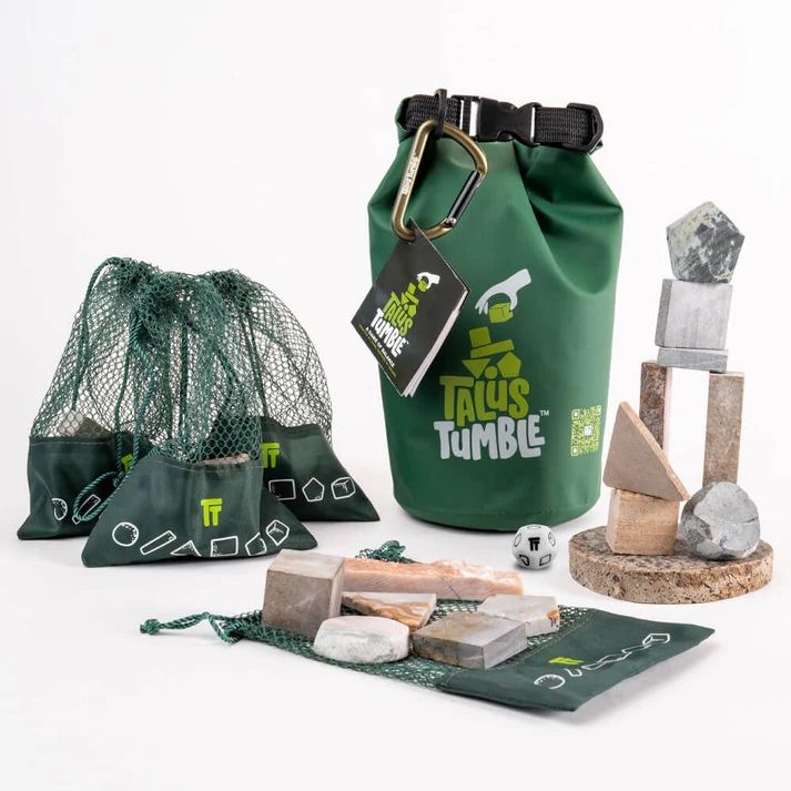 Descrizione: Players start with identical sets of six stones in different shapes and sizes. Players take turns rolling a 12-sided die, which may designate the stone to be placed, or require the removal of stones, or require that a stone or stones be placed in a certain way, etc. The first player to place all of his or her stones without causing a tumble wins the round and receives a point for each stone that the other players still have. Play to 21 points.