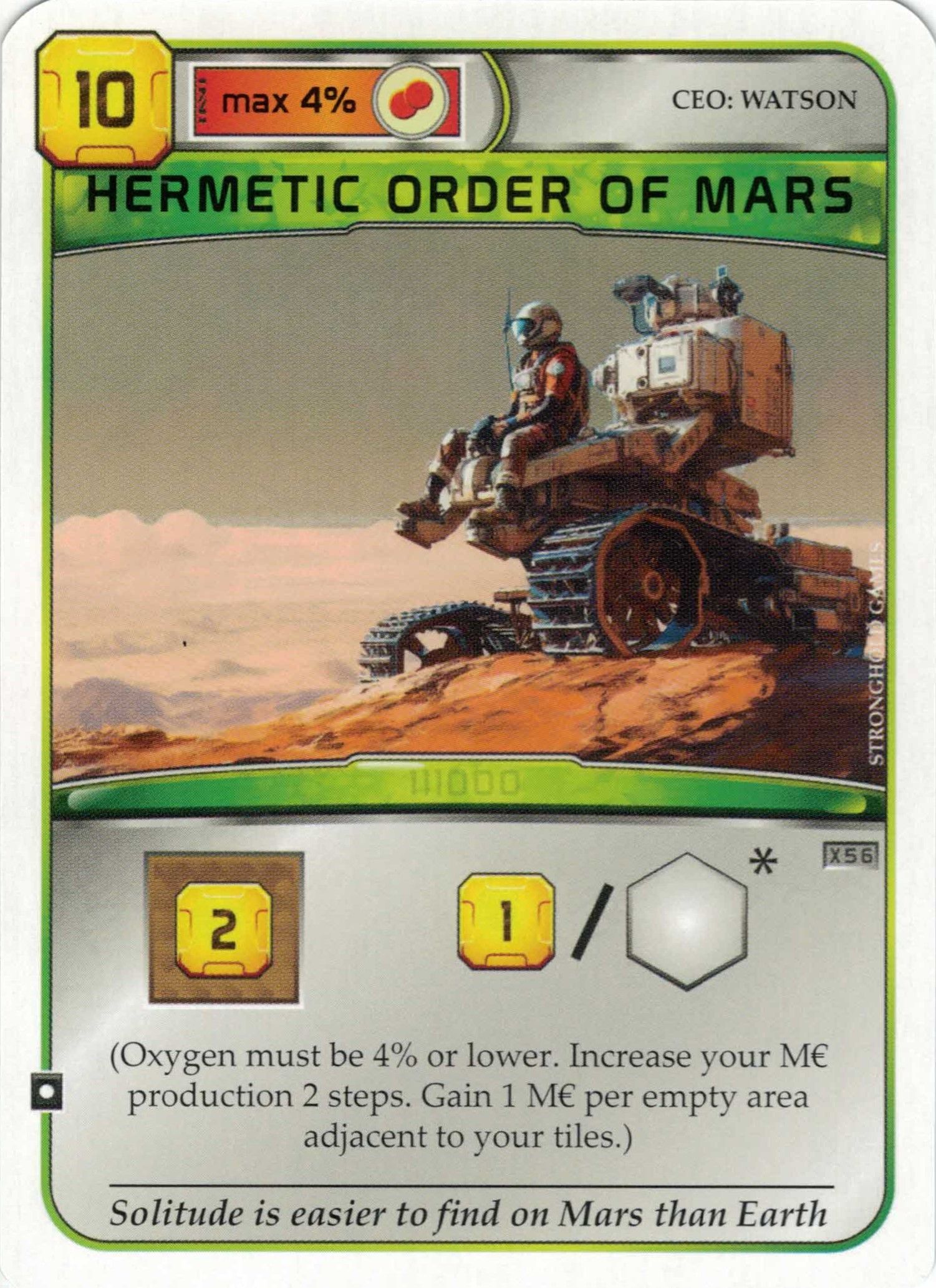 Oxygen must be 4% or lower. Increase your M€ production 2 steps. Gain 1 M€ per empty area adjacent to your tiles.