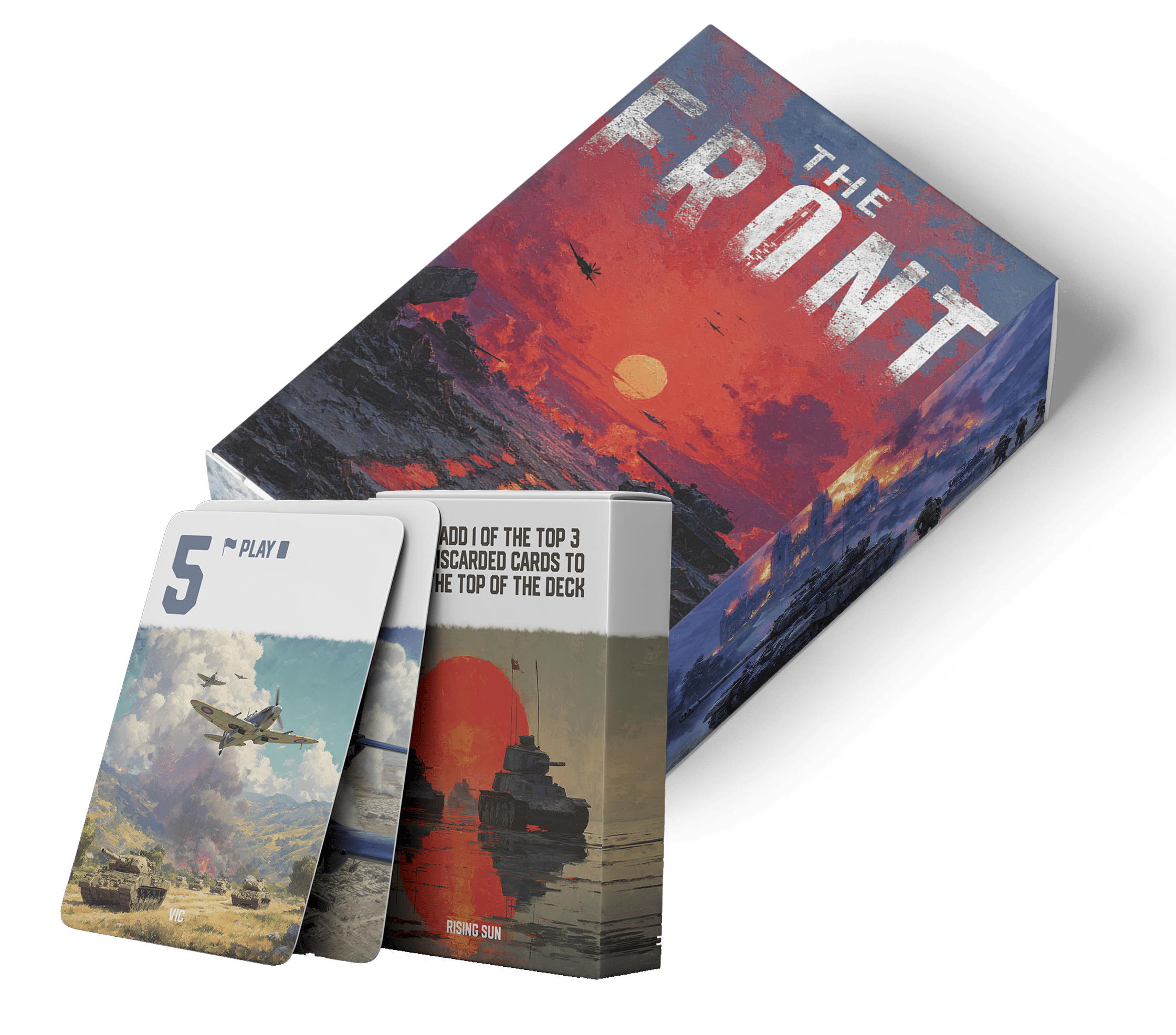 Descrizione: The Front is a fast-paced, strategic World War II card game where 2-5 players command iconic units across historic battlefields. Deploy troops, tanks, ships, and planes with unique effects, bluff your way through hidden plays, and outmaneuver your enemies to dominate the war front.