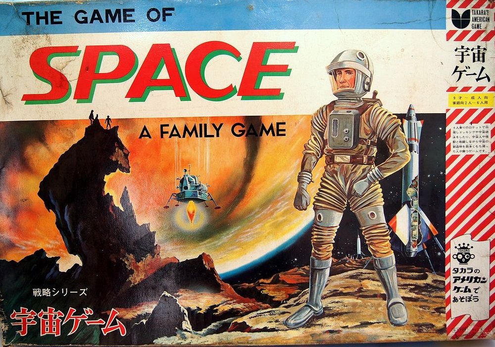 Descrizione: The Game of Space is a wonderfully elaborate Space exploration game from Japan around 1969. The 3D game board has a winding path for players to travel through the Solar System. The path has a space station that is the central command post, players travel around the planets passing 3D red and green satellites, cosmic graveyard, Space Swimming pool and Solar flares. The players path has a plethora of pictures of real and fictional craft from the 60's. On the playing board are an placed an Alien, a Space beauty, monsters, gold and Uranium Ore.