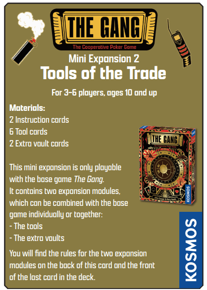 What's more, two additional vaults are included, both with extra security that you must overcome to open. From the original designers of The Gang, this mini expansion will bring more variety and challenge to the game for expert players!