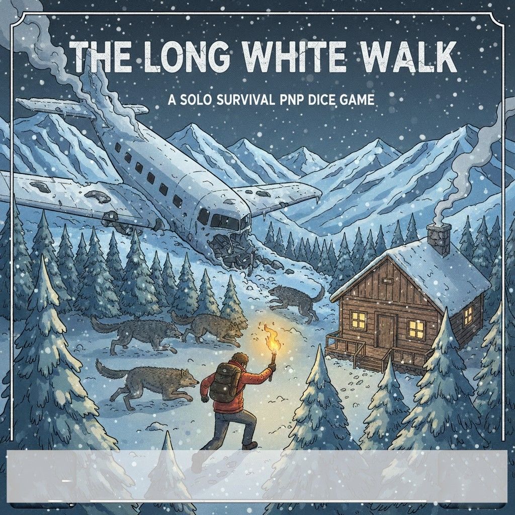 Descrizione: The Long White Walk is a solo print-and-play adventure that puts you in the shoes of a survivor struggling through a frozen land. After your plane crashes in the desolate area, your only goal is to survive and find a way to get rescued. Each step forward represents a grueling day of travel where the environment is as much of an enemy as the hunger of wild beast.