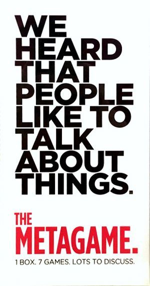 You don’t usually find games where players have debates like: Which is more fundamentally misunderstood - Fox News or the rainbow flag? The Metagame covers every possible kind of design, media, and art and helps you see culture in new ways. We’ve played The Metagame at hardcore tabletop game conferences and in dimly lit hipster bars. The Metagame works in just about any social setting - just pick the game variation that suits your group and situation the best.