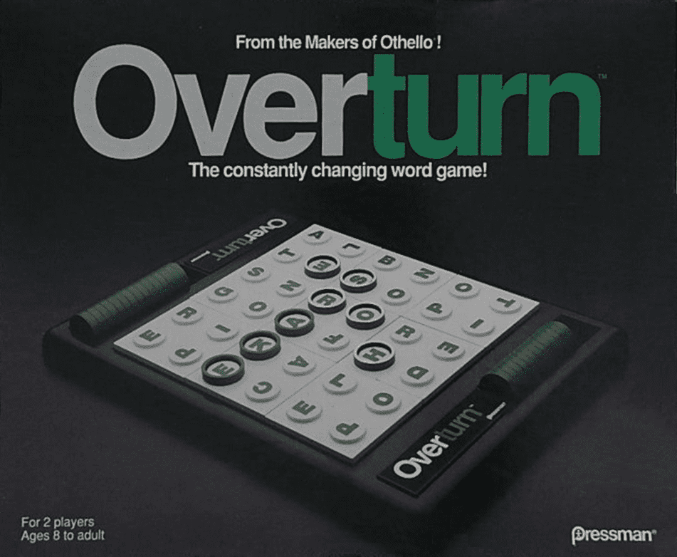 Overturn sports a modular board that changes with every game. It's kind of like a "find the hidden word" puzzles you used to play in the newspaper. Each player places colored rings over letters to make words. If you use the rings already placed by your opponent, you may turn the rings over to your color. Winner is the one with the most rings after all the letters have been used, or no more words can be made.