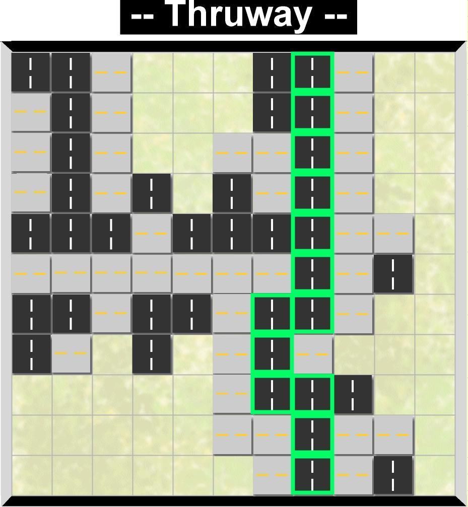 Goal: The first civil engineer to pave a thruway (connected path of horizontally and/or vertically adjacent indestructible road sections) connecting their two sides of the landscape wins the game.
