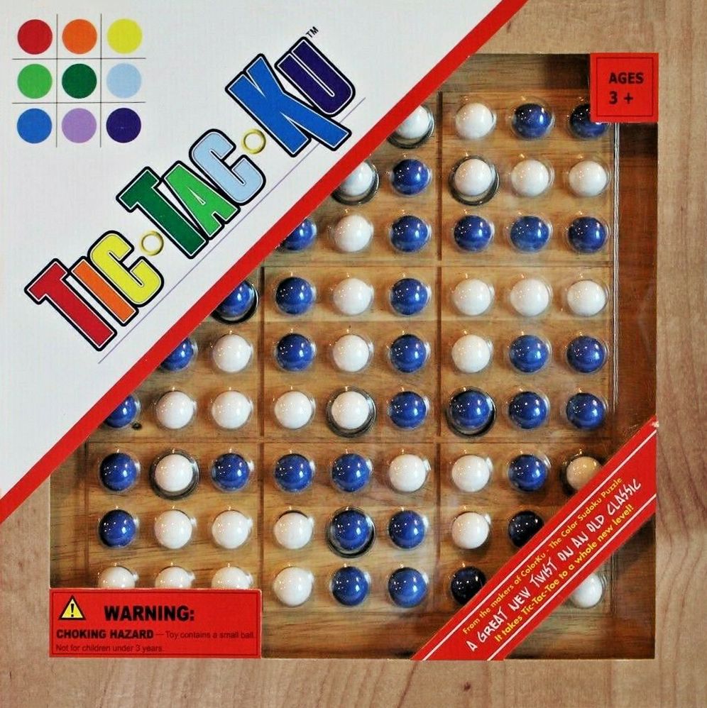Descrizione: Tic Tac Ku is played on a game board which is a 3 x 3 grid of Tic-Tac-Toe boards. In the simple game, the object is to get a Tic-Tac-Toe on any of the 9 boards. In the advanced game, the object is to get 5 Tic-Tac-Toes.