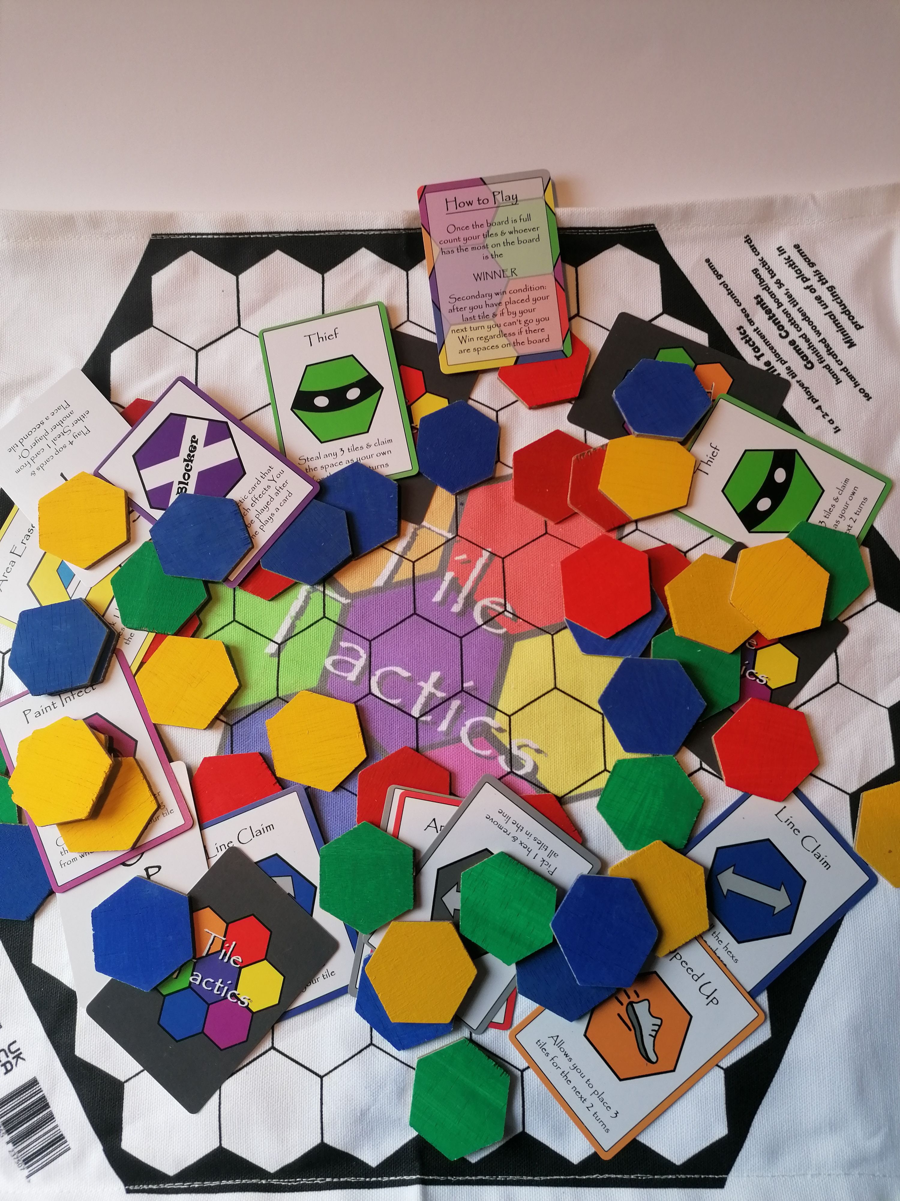 Descrizione: Tile Tactics is a 2-4 player area control tile placement tactical game, where you take it in turn to add wooden tile to a fabric game board or use powerful cards to claim even more tiles, can you control the most space by the end of a match