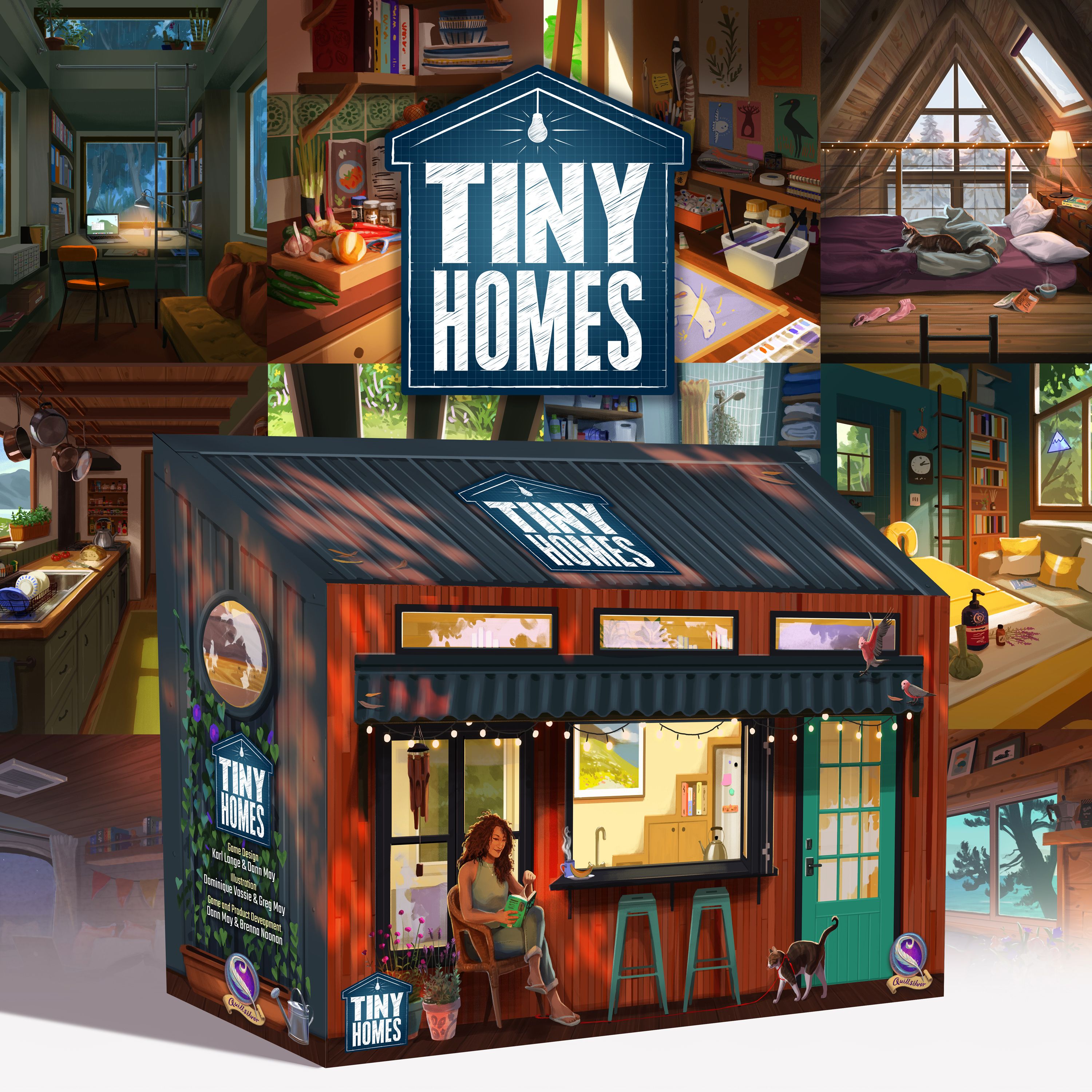 Descrizione: Tiny Homes is a game about fitting everything you need to live happily into the smallest and most efficient space. Each player starts with a small but expandable floorplan onto which they will place feature tiles to design their dream tiny home. Each round you and your neighbors walk through the Tiny Homes showroom warehouse and pick out Features (tiles) of varying shapes and sizes to add to your home. Rush ahead to secure a feature or take your time to pick up more. You'll want to collect at least one square of each feature type: bathroom/laundry, kitchen, bedroom, seat/surface, storage, productivity/hobby, and entertainment, but you will want more of certain features depending on the activities you are hoping to be able to do in your home! There are also three Styles of feature: Quality Features - These features bear the tick of quality. When you choose a Quality feature, take one of the available quality tokens — they may be eco-friendly, luxurious, high tech, or extra comfortable! Add the token to your Tiny Home Owner card to score at the end of the game based on your personal tastes. Compact Features - These tiles have floorspace on the back, meaning the feature can fold away completely. You'll be able to use the feature, then flip the tile, clearing space for you to move easily about your house and score activities (and help keep it nice and small). Dual-Use Features - These spaces have two uses, on one side might be a couch, but flip it over and it becomes a desk! Combining these tiles in clever ways to maximize (and minimize!) your tiny home is what the game is all about.