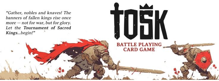 Descrizione: Tosk a.k.a. the Tournament of Sacred Kings (formerly known as Tilted Hilts) is a strategy playing card game of “hand”-to-“hand” combat between two champions. Players spend stamina (STA) to play action and ally cards, while conserving enough to replenish their hand afterward. The first player to reduce their opponent’s hit points (HP) to zero by overpowering their defenses wins the battle!